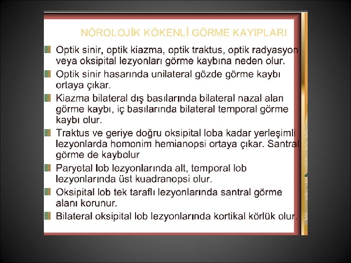 Lezyon yerleşimi Etyolojik neden Retina Vasküler: Emboli, Dev hücreli arterit, İnfeksiyon: Sitamegalovirüs, Toksoplazma Toksik-metabolik-avitaminozlar: Tütün, alkol, Etambutol, INH, iodoquinol, kloramfenikol, amiadoron Dejeneratif: Retinitis pigmentosa Optik disk ve sinir §Glokom §Papilla ödemi: İntrakraniyal basınç artışı §Papillitis ve Retrobulber Nöritis: İnflamatuvar; infeksiyöz, demiyelinizan lezyonlar §Vasküler: İskemik (nonarteritik, arteritik), anevrizma basısı §Toksik-metabolik: Tütün, alkol, B 1 ve B 12 hipovitaminozları, INH, etambutol § Travma §Tümör: Gliomlar, meningiomlar, kraniyofaringeoma, hipofiz tümörleri, karsinomatöz menenjit, lösemi, lenfoma