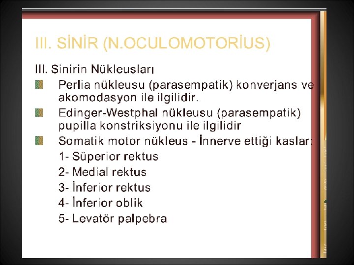 Duysal Motor I II III N. olfactorius N. oculomotorius IV V VI VIII IX X XI XII N. Trochlearis N. opticus N. trigeminus N. abducens N. facialis N. statoacusticus N. glossopharyngeus N. vagus N. accessorius N. hypoglossus Otonom Refleks