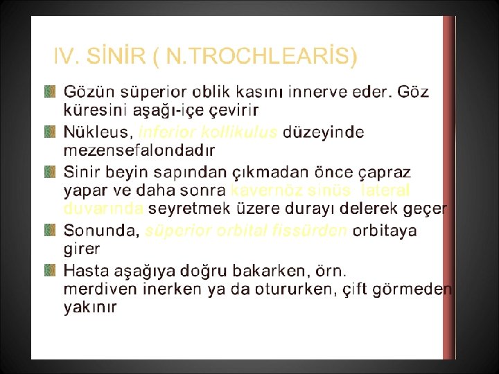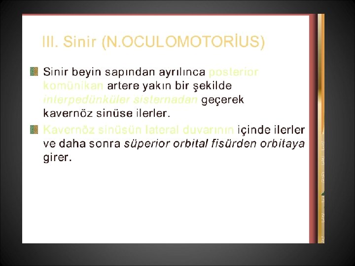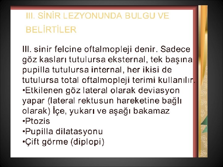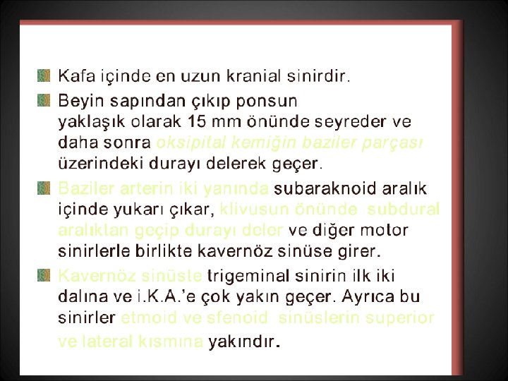 KAVERNÖZ SİNÜSTE YERLEŞİK LEZYONLAR SUPERİOR ORBİTAL FİSSÜRDE YERLEŞİK LEZYONLAR PERİFERİK DALLARI ETKİLEYEN LEZYONLAR İnfeksiyon İnflamasyon; Bakteriyel-tbc-karsinomatözgranülomatöz menenjit Travma Kafa kaidesi fraktürü Tümör Paget hastalığı Vasküler Anevrizma, infarkt (DM) Guillain-Barre sendromu