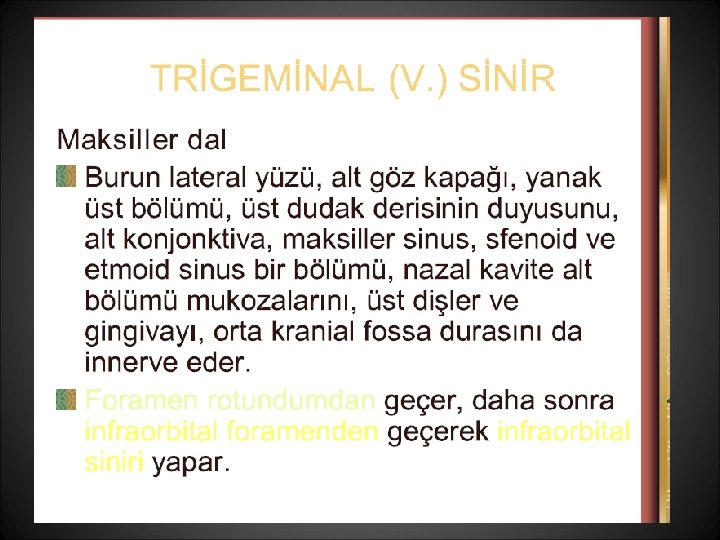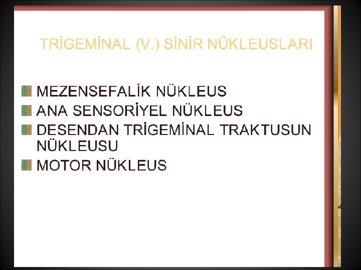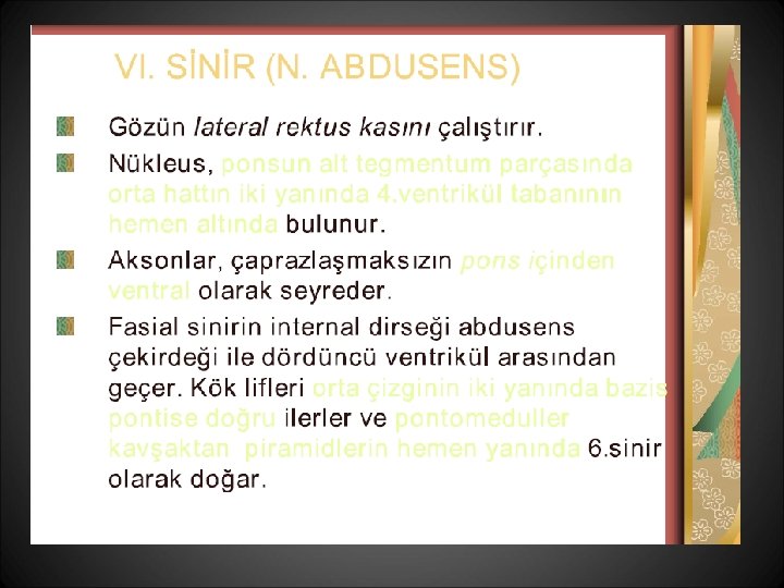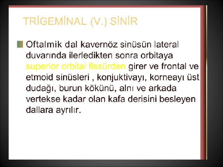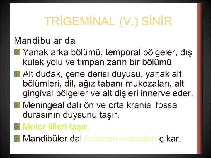 V. NERVUS TRİGEMİNUS Duysal § Yüz § Oral-nazal kavite §Dilin 2/3 ön kısmı: Ağrı-ısı-dokunma §Meninksler: Ağrı Motor Çiğneme kasları, tensor veli palatini Refleks Kornea-Göz kırpma, çene