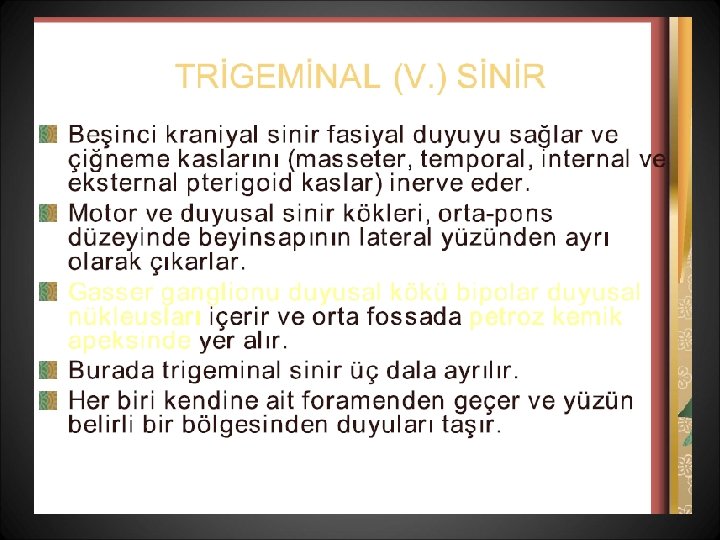 Preganglionik sinir kökleri: Subaraknoid alan TRİGEMİNAL NEVRALJİ ? GASSER GANGLİONUNDA YERLEŞİK LEZYONLAR Vasküler Anevrizma, kollagen doku hastalıkları Tümör İnfeksiyon H. Zoster, abse, petrozitis