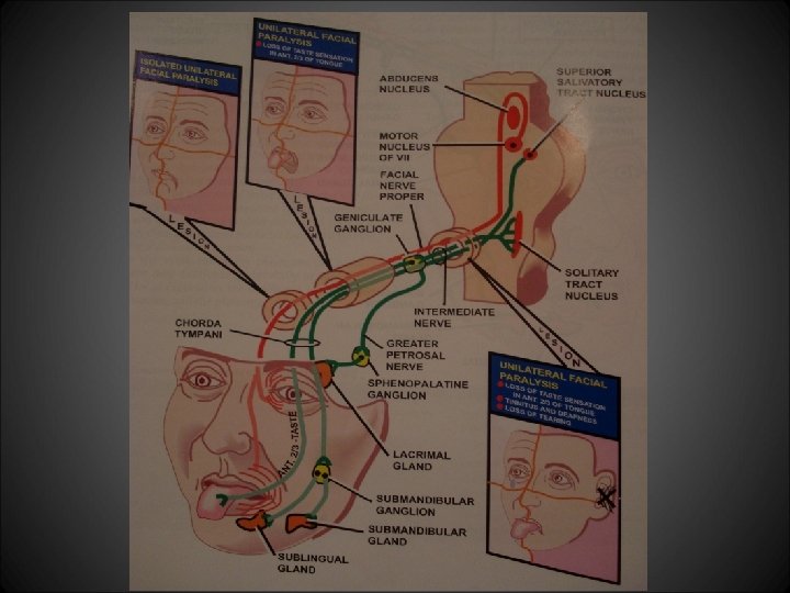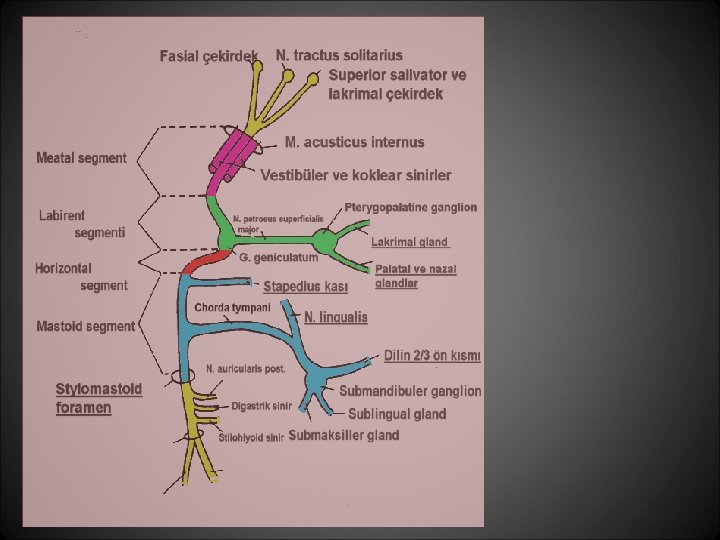 V. NERVUS FACİALİS Motor Mimik kaslarının innervasyonu Parasempatik § Gözyaşı, § Nazal-palatal mukoza ve § Tükrük glandlarının innervasyonu Refleks Göz kırpma-kornea, stapedius refleksleri Duysal § Farinks (+IX) § Burun ve damak mukozası (+V) § Dışkulak yolu (+IX), § Kulak ve mastoid üzeri derinin § Dilin 2/3 ön kısmı: Tad duyusu