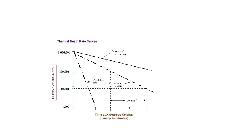 Survival of Bacterial Spores during heat processing (Decimal Reduction) • Thermal destruction of bacteria or spores takes place in definite pattern. • Suspension of bacterial spores exposed to constant lethal temp. • Logarithms of the number of the surviving spores are plotted against time on linear scale (or the number of survivors in a log scale against time in linear scale) a straight line graph will be obtained.