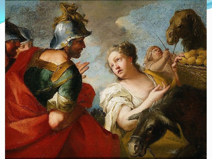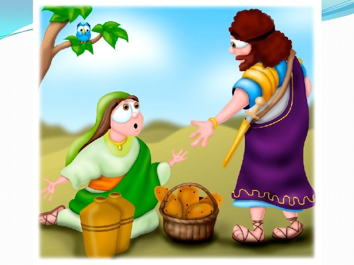 Dávid és Abigail – 1 Sám 25 �Dávid – Nábál: �Helyi hatalmasság, védelmi pénz. � 2. vers: 3000 juh és 1000 kecske �Dávid és emberei: � 600 fős szabadcsapat, magánhadsereg. � 5. vers: 10 legény, šālōm – 15. vers: 400 ember karddal �Máón: ökológiai fülke, hatalomátvétel – Nábál strokeja 38. vers. �A nő azé, akié a hatalom – 40 -42, vers: lábmosás…