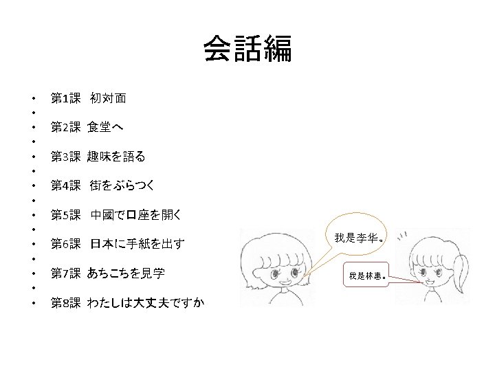 Dì-yī kè Chūcì jiànmiàn • • • • スキット Ⅰ Zhōngguó xuésheng : Nǐ hǎo ! Nín guìxìng ? Rìběn xuésheng : Nǐ hǎo ! Wǒ xìng 〇〇, wǒ jiào 〇〇〇. Zhōngguó xuésheng : Nǐ shì cóng nǎ guó lái de ? Rìběn xuésheng : Wǒ shì cóng Rìběn Shénhù lái de. Zhōngguó xuésheng : Shénhù de nǎ ge dàxué ne ? Rìběn xuésheng : Wǒ shì Shénhù nǚzǐ dàxué 〇〇〇〇 xì , 〇 niánjí de xuésheng. スキット Ⅱ Lín Huì : Rènshi nǐ, wǒ hěn gāoxìng. Lǐ Huá : Zhè shì wǒ de shǒujī hàomǎ. Lín Huì : Xièxie ! Zhè shì wǒ de yóujiàn dìzhǐ. Lǐ Huá : Yǐhòu wǒmen duōduō liánluò ba !
