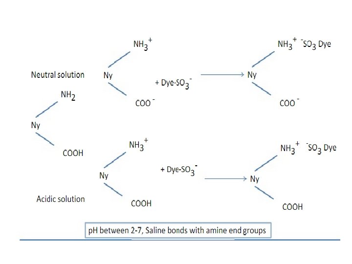 Acid Dyes • Attached to fiber by ionic or salt linkage at “dye site”. • Dye site in wool is amino group (NH 2); • Applied under acidic conditions, their types are: – Good leveling characteristics – Average leveling characteristics – Poor leveling characteristics