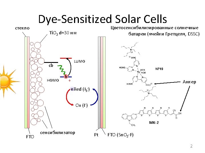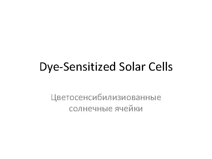 Types of Devices - Liquid-state DSSC’s. contains active Red/Ox system like 3 I-/I 3 -, Co 2+/Co 3+ etc. in high polar solvent like CH 3 CN, Me. OCH 2 CN etc. + Easy to assemble High efficiency - Solvent leakage Low efficiency at low temperature Many component system - Solid-state DSSC’s contains solid hole transporting layer like spiro-Me. OTAD and Ag, or Al layer + Highest efficiency (15. 7%!!!) No solvent Flexibility - Vacuum process High sensitivity to UV and air Limitations by the pores filling