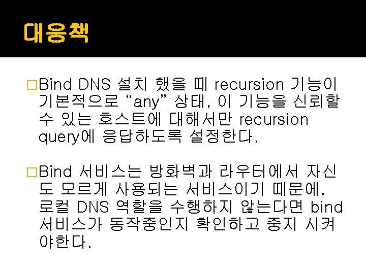 DNS Zone Transfer 방어 �named. conf(/etc/named. rfc 1912. zones) allow-transfer { x. x; }; Zone 데이터를 획득할 수 있는 시스템 제한 Secondary 서버는 zone data를 넘길 일이 없으므 로 allow-transfer {none; }; 설정 � TSIG BIND-8. 2 이상 버전에서 지원 Zone 데이터에 대한 인증과 검증 Primary master name server와 slave name server에 암호 키를 설정 통신할 때 암호 키를 사용해서 인증