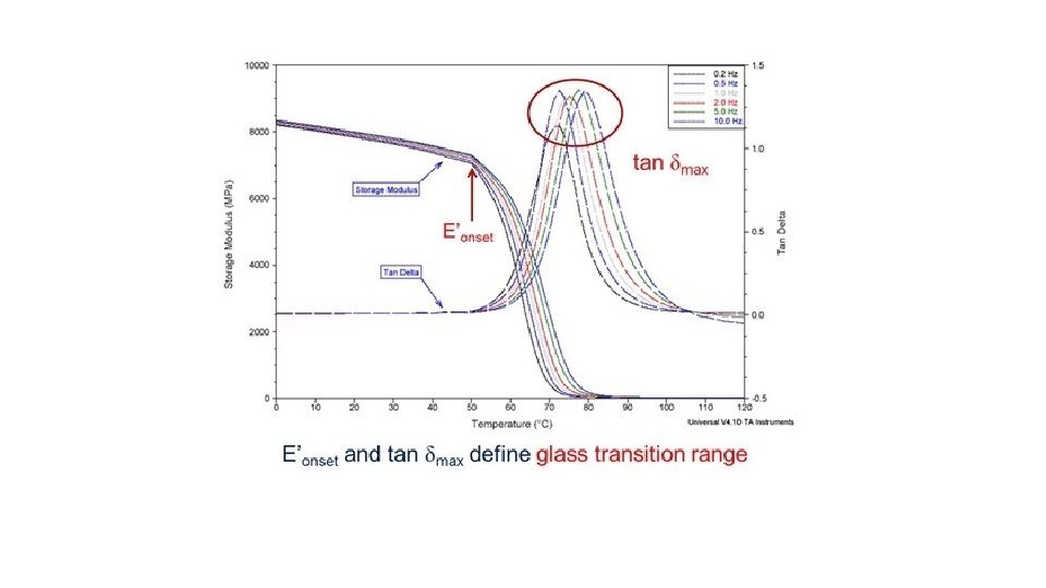 For example, the DMA curve of polycaprolactone measured at a meachnical vibration frequency of 1 Hz is shown below: The drop in storage modulus (E') and peak in damping factor (tan delta) between -60 and 30°C is due to the glass transition (Tg) of the amorphous polymer in this semi-crystalline material. Above 50°C the sample begins to melt and flow, thus loosing all mechanical integrity. Below the Tg small peaks are evident in the tan delta curve at -80 and -130°C. These are the beta and gamma transtions in this polymer (the glass transition is known also as the alpha transition) and are caused by local motion of the polymer chains as opposed to large scale co-operative motion that accompanies the Tg. These small transitions are very difficult to observe by DSC but are often very important in determining the impact resistance of the polymer.