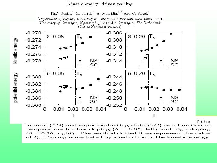 Kinetic energy change in t-J K Haule and GK Kinetic energy increases cluster-DMFT, cond-mat/0601478 Kinetic energy decreases Kinetic energy increases cond-mat/0503073 Phys Rev. B 72, 092504 (2005) Exchange energy decreases and gives largest contribution to condensation energy
