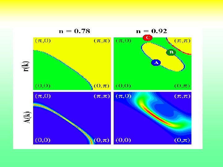 Follow the “normal state” with doping. Civelli et. al. PRL 95, 106402 (2005) Spectral Function A(k, ω→ 0)= -1/π G(k, ω → 0) vs k U=16 t, t’=-. 3 K. M. Shen et. al. 2004 If the k dependence of the self energy is weak, we expect to see contour lines corresponding to Ek = const and a height increasing as we approach the Fermi surface. 2 X 2 CDMFT
