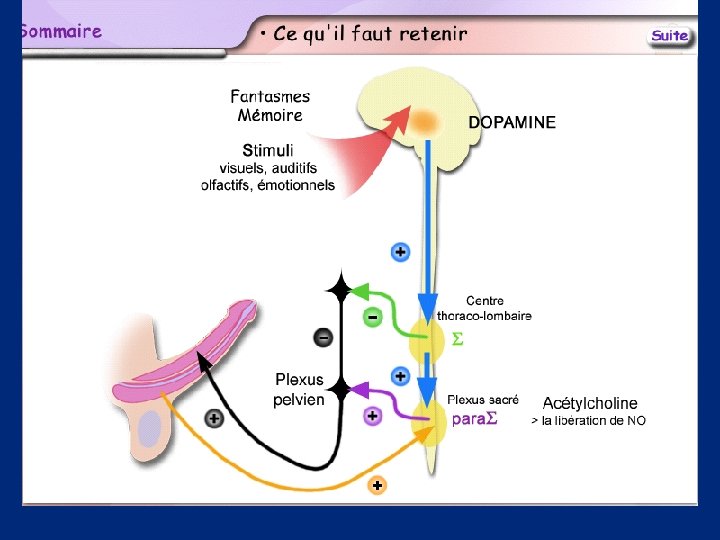 1) Une meilleure compréhension des mécanismes anatomo-physiologiques de l’érection èL’érection résulte d’un processus neurovasculaire sous la dépendance du SNC et du SN Autonome : Désir SNC Erection S N Autonome Blocage du retour veineux Relaxation FML Vasodilatation-Relaxation Caverneuse