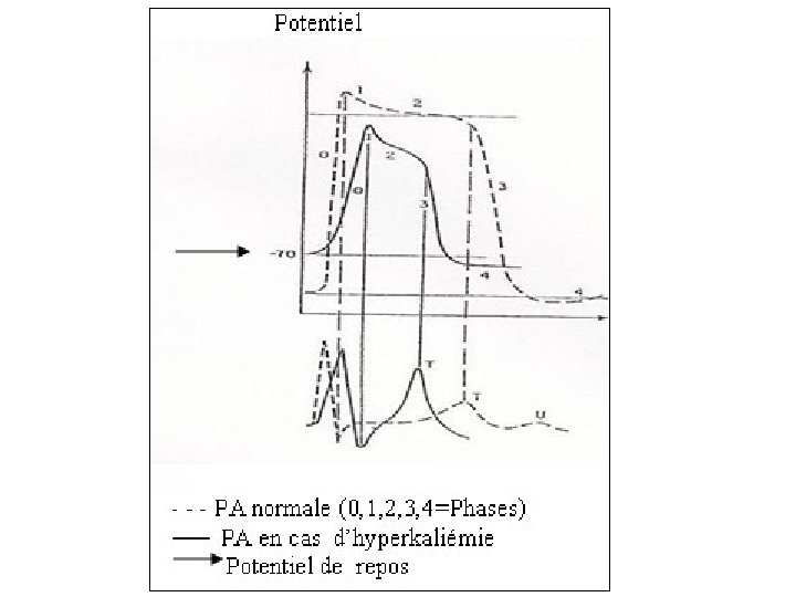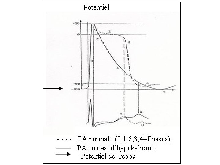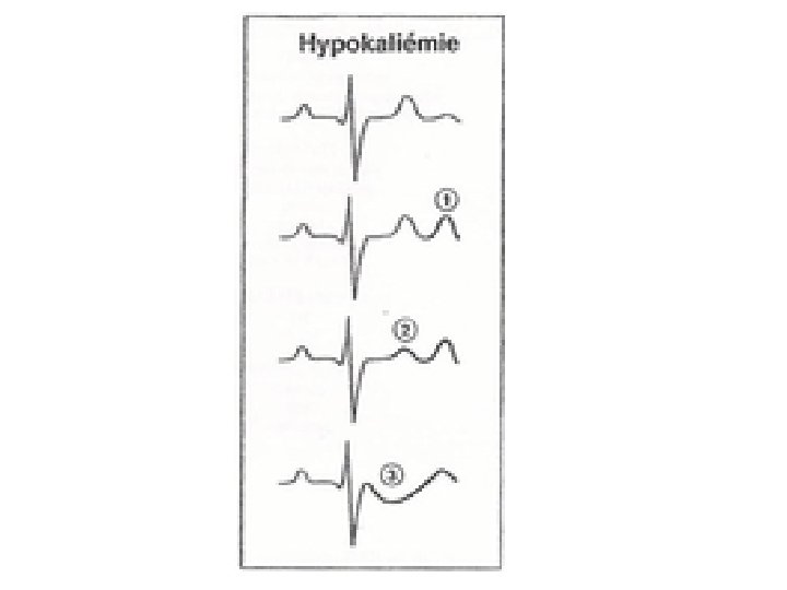 • Les signes cardiaques: • Cliniques: assourdissement des bruits, hypotension, élargissement de la différentielle • ECG: troubles de la dépolarisation • Aplatissement de l’onde T puis inversion • Apparition d’une onde U, U/T > 1 • Sous décalage ST • TDR: ESA, TSA, FA, ESV, TV, FV, torsade de pointes