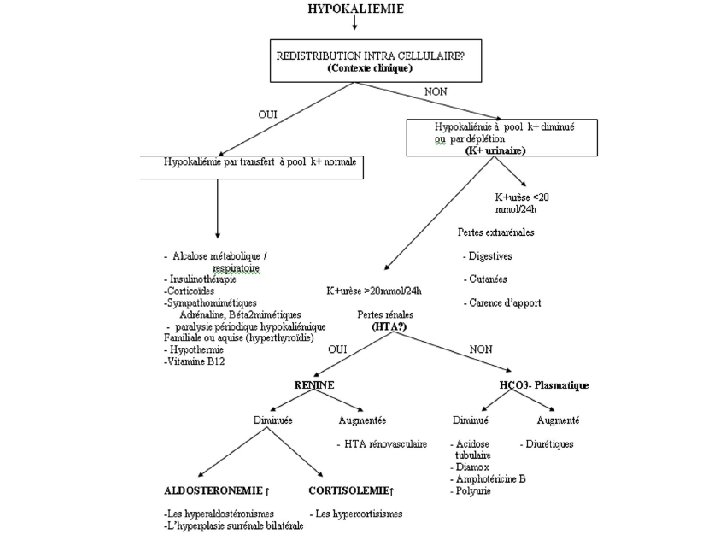 Etiologies 1. Hypo. K par transfert: • Alcalose metabolique ou respiratoire (la kaliemie baisse en moyenne de 0. 5 mmol par elevation de p. H de 0. 1) • Apport d'insuline, mineralocorticoides, sympathomimetiques (adrenaline, beta 2 mimetique ) • Paralysie périodique familiale ou acquise lors des hyperthyroïdies