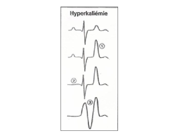 Traitement • Urgence • Arrêt de tout Trt hyperkaliémiant • Induire le transfert transmembranaire: Alcalinisation (50 -100 ml de bicar 8, 4%), Insulineglucose (30 UI/500 ml SGH 30%) sur 1 h • Antagonisation du K au niveau myocardique: Gluconate de Ca++ 1 g IVL, max 4 g • Résine échangeuse de cations: Kayéxalate 45 g/6 h • Elimination du K en excès: dialyse, furosémide