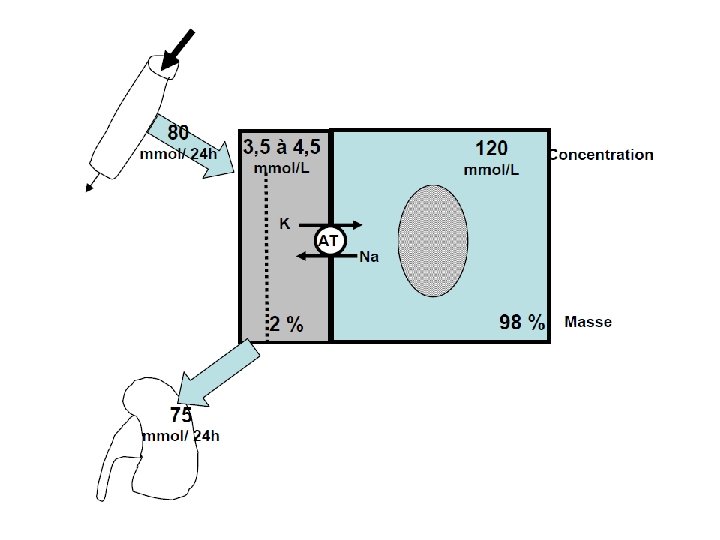 Métabolisme • Stock potassique 50 mmol/Kg, 80% échangeable • Reparti essentiellement au niveau du muscle, foie, globules rouges • SEC ne présente que 2 % du potassium total • Le potassium est principalement IC soit 98 % • [SIC] 20 x> [SEC](100 a 150 mmol/l) • Système actif Na+/k+ ATPase • La kaliémie normale varie entre 3. 5 et 5 mmol/l