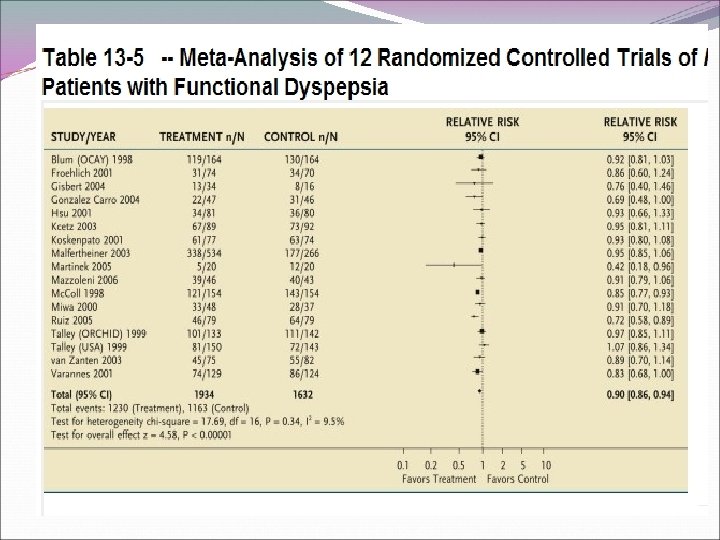 � Proton pump inhibitors — Several studies have evaluated the efficacy of proton pump inhibitors (PPIs) in nonulcer dyspepsia and at least two metaanalyses have been performed that reached similar conclusions [ 48, 49]. A meta-analysis of seven studies (with a total of 3725 patients) found that PPIs were significantly more effective than placebo for reducing symptoms (relative risk reduction of about 10 percent, 95% CI 2. 7 -17. 3 percent) [ 48]. In a stratified analysis, efficacy was confined to patients with ulcer-like and refluxlike symptoms, but not in those with dysmotility-like symptoms or unspecified dyspepsia. The major problem with the trials is the possibility that patients with GERD could have been misclassified as having dyspepsia. � The largest study, which is one of the most methodologically rigorous, included 1262 patients who were randomly assigned to receive omeprazole (20 or 10 mg daily) or placebo for four weeks [ 50]. Complete symptom relief was observed significantly more often with both doses of omeprazole compared with placebo (38 and 36 versus 28 percent, respectively). The benefit was greatest in those with ulcer-like or reflux-like symptoms; there was no significant benefit in patients with dysmotility-like symptoms. Similar conclusions were reached in another large placebo-controlled trial [ 51].