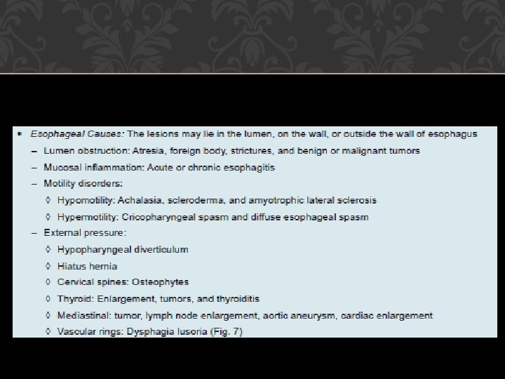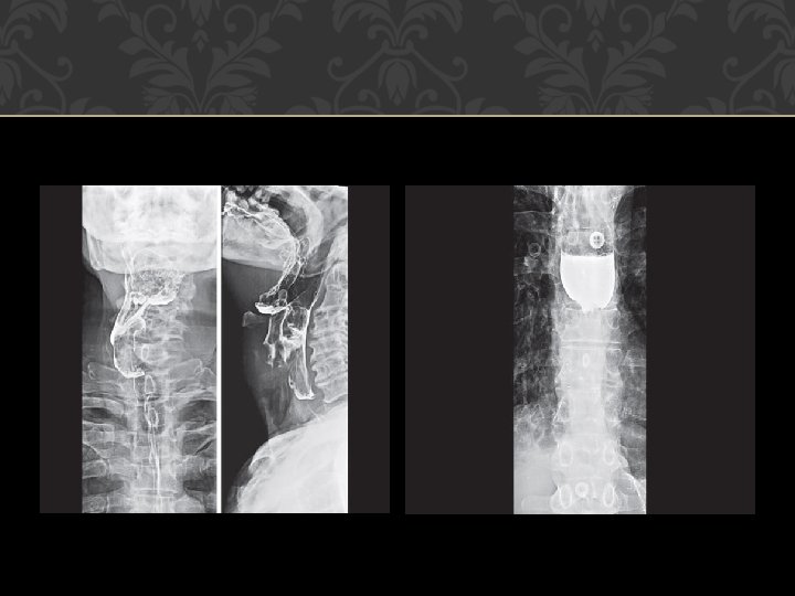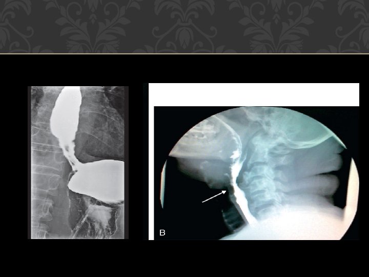 EVALUATION History �Sudden onset: Foreign body or impaction of food on a stricture or malignancy, and neurological lesions. Gradually progressive: Malignancy (short history with weight loss) and peptic strictures (long history with heartburn). Chronic, continuous and not progressive: Stricture. �Intermittent : Spasms or spasmodic episodes over an organic lesion. �Liquids/solid s: More with liquids (paralytic lesions), more with solids, and progressing to liquids (malignancy). �