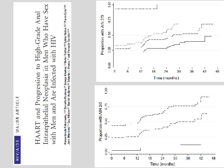 VIH et AIN • • Infections HPV persistantes HPV HR (16+++) Infections multiples Protéines E 6/E 7 Augmentation des prévalences des AIN Population AIN 2 -3 Palefsky JM, Aids 1998 VIH+ MSM+ 81% 52% Kreuter A, Br J Dermatol 2010 VIH+ MSM+ 72% 35% De Pokomandy A, Clin Infect Dis 2011 VIH+ MSM+ 41 -97% VIH+ MSM- 34% VIH- MSM+ 14 -28% VIH+ Femme 26 -40% VIH- Femme 8% Holly EA, J Natl Cancer Inst 2001 6 -18%