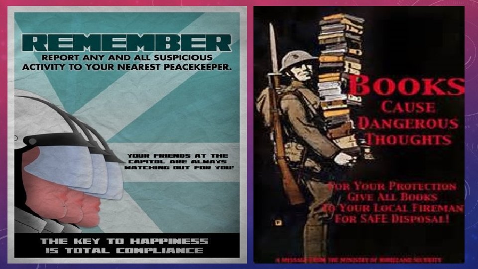 NEW WORLD PROPAGANDA • • In your dystopian world, the government will be in charge of all the laws, forcing society to be the way it is. Your character might react against it, but the government will want to keep everyone happy. To do this, they’d use propaganda, just as governments do now to try to persuade the people. TASK: Create your own propaganda poster or collage for your dystopian world. Please send a picture of your completed dystopian poster. • [If you'd prefer to do more of a mind map than an artistic poster, feel free!] • There a couple of dystopia propaganda posters on the next slide and there are loads more online to look at as inspiration.