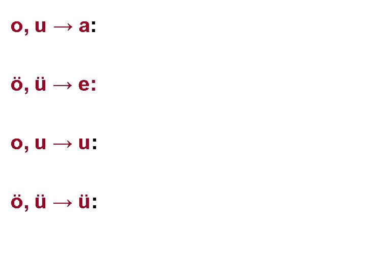 o, u → a: orman, ozan, oba, ova, çoğalmak, uğramak, ulaşmak, uzak, ö, ü → e: öyle, ötmek, öte, ödenek, söyle, gölge ürkek, üleşmek, güreş, kürek, süslenmek o, u → u: ordu, boğul, doğu, dokuz, oğuz, bozuk uğur, suçlu, burun, durum, kuruluş ö, ü → ü: ölüm, bölüm, çözüm, döküntü üzüntü, büzüşük, dürüm, yüzücü