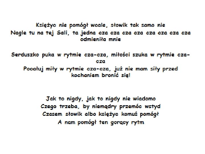 ref. Przecież liczy się kolor serca Ile ciepłych barw mieszka w nim. Tylko własny twór, kolor serca Może dodać Ci sił w te pochmurne złe dni. Kiedy czujesz się jak własne pół własne wspak, Gdy cię wciąż dogania pech. Kiedy los uwziął się, daje wszystko na nie To nie ważne, to zmieni się