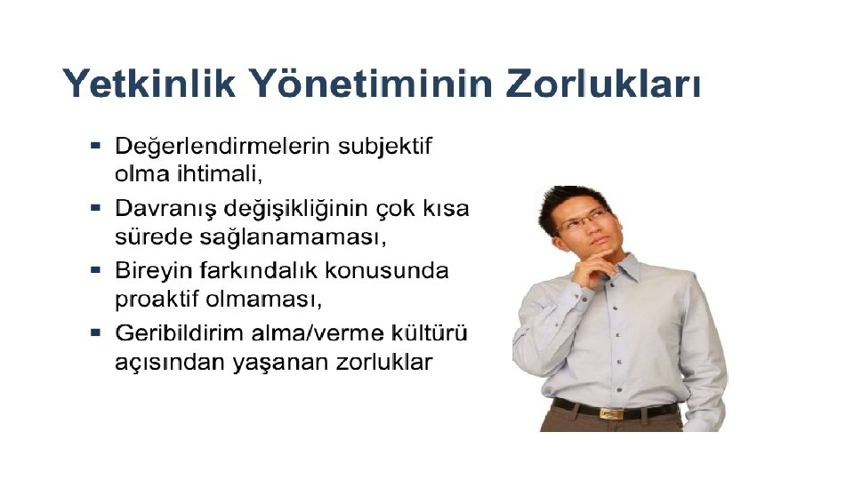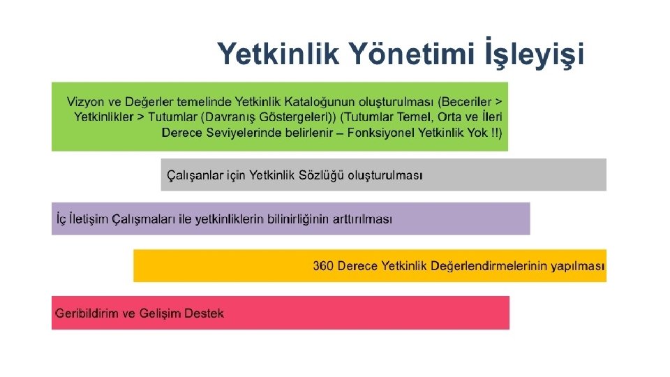 Yetkinlik Bazlı Yönetimin Problemleri • Yetkinlik bazlı yönetim ancak tüm yöneticiler uygularsa işe yarar. Yetkinlik çalışmalarına tüm yöneticiler katılmalı ve belirli periyotlarla güncellenmelidir, aksi takdirde bir grubun toplanıp yetkinlikleri belirlemesi, yalnız o dönemdeki insanlar için geçerli ve bütünsel kontrolü olmayan bir sistem ortaya çıkarır. • Yetkinlikleri tanımlamak ve değerlendirmek oldukça zor bir süreçtir. Bazı yetkinlikler davranışlar kapsamında doğrudan ölçülemez ve bazı yetkinliklerin değerlendirilmesi objektif değildir. • Yöntemin çalışanlar tarafından az anlaşılması, • Yöneticilerin sisteme çok bağlılık göstermemeleri, • Üst yönetimin sahiplenme ve destek eksikliği.