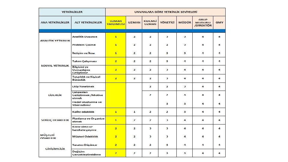 YETKİNLİK TÜRLERİ Temel Yetkinlikler: Tüm çalışanlardan beklenen ve işletmenin değerleriyle örtüşen yetkinliklerdir. İşletmede çalışmak için olmazsa olmaz davranışları içerir ve en alt kademeden en üst kademeye kadar tüm çalışanlardan aynı oranda beklenir. “İletişim”, “takım çalışması” gibi yetkinlikler örnek verilebilir. Yönetsel Yetkinlikler: İşletmenin yöneticilerinden beklediği ve yönetim kademelerine göre farklılaşabilen kritik davranışlardır. “Planlama ve organizasyon”, “astlarını geliştirme” gibi yetkinlikler örnek verilebilir. Teknik (Fonksiyonel) Yetkinlikler: Çalışılan bölüm bazında farklılaşan yetkinliklerdir. Her departmanın ya da fonksiyonun kendine özgü beklenen davranışları vardır ve teknik yetkinlikler bu farklılıkları ortaya koymaya çalışır.