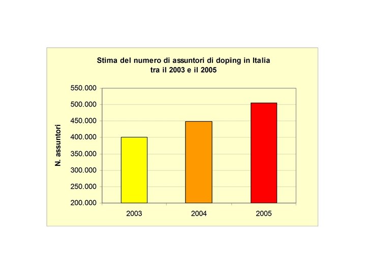 2. 243. 843 numero dosi sequestrate Per stimare il totale delle dosi consumate in Italia, a fini di doping, occorre considerare che: A) i farmaci sequestrati in una singola indagine rappresentano, al massimo, il 15% del totale dei farmaci oggetto di quel “movimento” di traffico. B) oggetto di indagine. A 15 % 12, 5 % 10 % 5% 299. 179. 058 359. 014. 870 448. 768. 588 4% 373. 973. 823 448. 768. 588 560. 960. 735 3% 498. 133. 132 597. 759 747. 199. 699 B Calcolando un consumo medio annuo, per assuntore, di circa 1000 dosi (ad esempio 4 pasticche e 1 fiala giornaliere, per 200 giorni all'anno), il numero degli assuntori, in Italia, nel 2004, è stimabile in 448. 769.