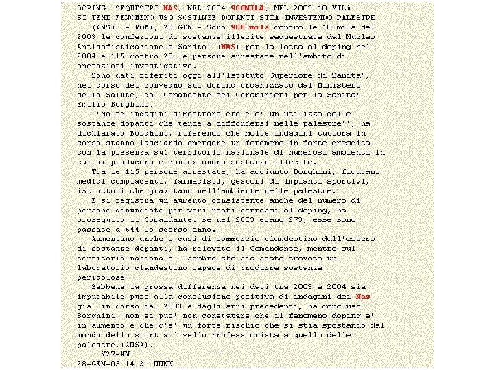 IL 2 0 0 4 N. dosi TIPOLOGIA sequestra FARMACO te Anabolizza nti % dei casi indicati Stima Valore complessiva complessivo 61, 8 2. 060. 434 6. 181. 301 1. 273. 348 83, 3 64. 958 714. 538 GH 54. 110 84, 7 48. 276 434. 486 Epo 40. 890 85, 7 70. 175 561. 400 Stimolanti 60. 140 2. 243. 843 7. 891. 725 TOTALE 1. 428. 488 Per giungere al totale delle dosi sequestrate di farmaci e sostanze dopanti, i casi privi di indicazioni sono stati calcolati sulla media dei casi dettagliatamente specificati dagli inquirenti.