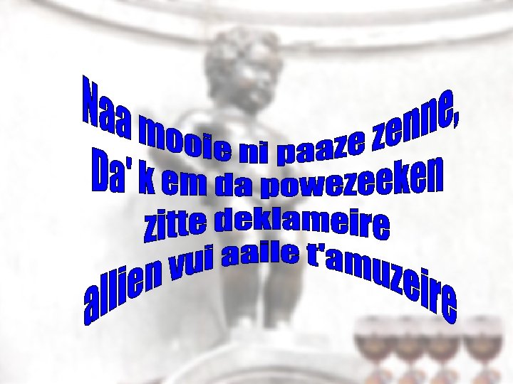 Neineie neineie ik em aaile wille demonsteire dat sa er soemegste zaain dee uile mé konvikse e stuk in uilen uur drinke dat da ni es seul'ment en allien vui te kunne drinke, mo wel vui ne ki goo zat en gielegans doefes te kunne zaain. Want den vergeite z'uile mizeire en vergeite z'uile paain;