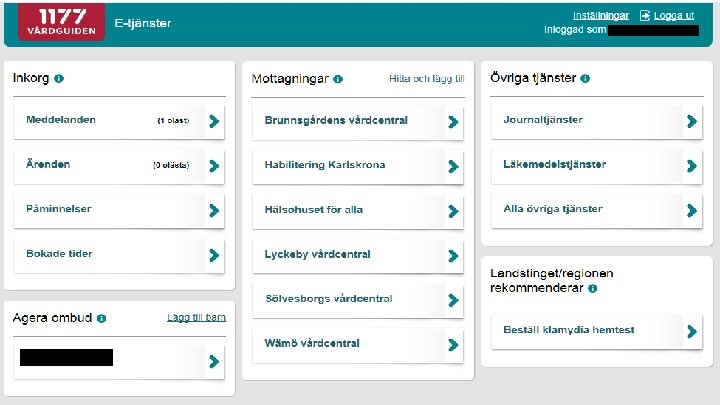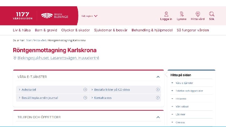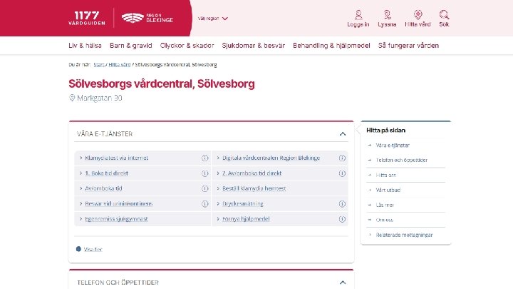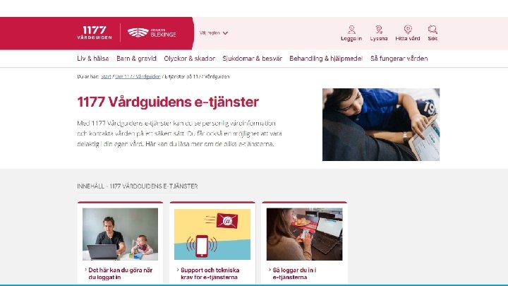 Det här är 1177. se • • • Informationskälla samt rådgivning för patienter och allmänhet Presenterar och ger kontaktuppgifter till våra mottagningar E-tjänster som underlättar vardagen för våra invånare