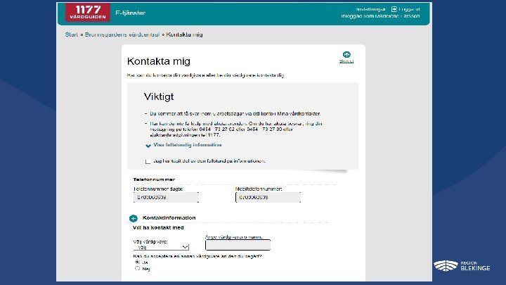 Generellt basutbud och villkorstexter Kontakta mig Här kan du kontakta din mottagning eller be din mottagning kontakta dig. Viktigt Du kommer att få svar inom 3 arbetsdagar via ett meddelande här på 1177 Vårdguidens etjänster. Vi kan tyvärr inte hjälpa dig med akuta ärenden. Om du har akuta besvär, ring din mottagning på telefonnummer xxx eller sjukvårdrådgivningen på telefonnummer 1177. Nödnumret 112 finns om du själv eller någon i din närhet behöver akutsjukvård. 1177 Vårdguidens e-tjänster är personliga. Du kan använda våra tjänster för dig själv eller för ditt barn som är under 13 år. För att utföra ärenden åt en annan person behöver du vara registrerad som den personens ombud här på 1177 Vårdguidens e-tjänster. DIGITALISERINGSENHETEN – EHÄLSOLYFTET 2019
