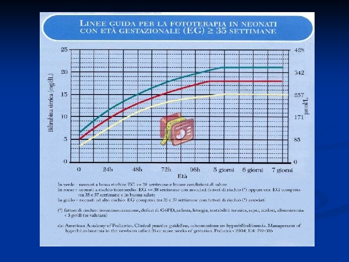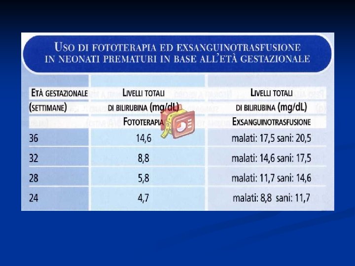 TERAPIA DELL’IPERBILIRUBINEMIA NEL PREMATURO IN BASE AL PESO ALLA NASCITA (*) Peso (g) Fototerapia Exsanguinotrasfusione <1000 in 1 a giornata di vita >10 -12 mg/dl 1000 -1500 7 -9 mg/dl 12 -15 mg/dl 1500 -2000 10 -12 mg/dl 15 -18 mg/dl 2000 -2500 13 -15 mg/dl 18 -20 mg/dl (*) da Cloherty et al. : Manual of Neonatal Care, 2004.