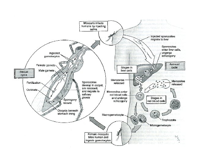 Sporogony • occurs in mosquito (9 -21 d) • fusion of micro- and macrogametes • zygote ookinete (~24 hr) • ookinete transverses gut