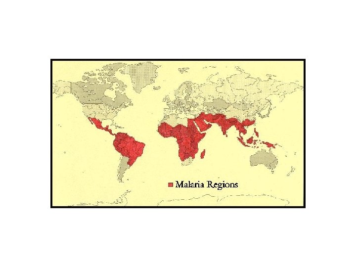 MALARIA * Cosmopolitan disease in tropical and sub tropical regions of the world * Most important vector-borne disease * Romans called it “mala aria”- disease emanating from the swamps * Caused decline in the Roman empire? * Caused problems in finishing the Panama Canal- Gorgas * The causal agent only identified in 1897 * Malaria symptoms and use of insect repellents recorded in Ebers papyrus (~ 3000 bc) * Was malaria present in the Americas before the arrival of Columbus?