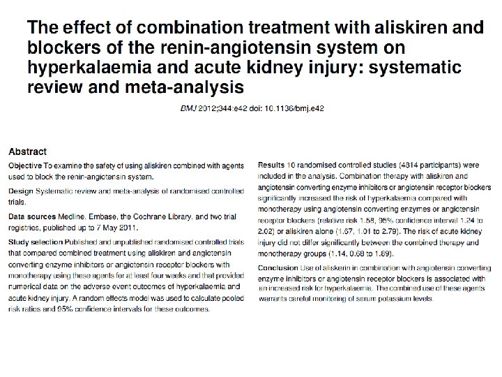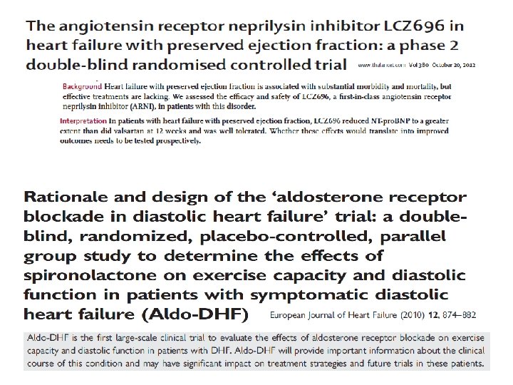 ANGIOTENSIN RECEPTOR BLOCKERS FOR HEART FAILURE Cochrane Database Syst Rev. 2012 Apr 18; 4: CD 003040. (Review) PMID: 22513909 • OBJECTIVES: To assess the benefit and harm of ARBs compared with ACE inhibitors (ACEIs) or placebo on mortality, morbidity and withdrawals due to adverse effects in patients with symptomatic HF and left ventricular systolic dysfunction or preserved systolic function. • SEARCH SELECTION CRITERIA: Double blind randomised controlled trials in men and women of all ages who have symptomatic (NYHA Class II to IV) HF and: 1) left ventricular systolic dysfunction, defined as left ventricular ejection fraction (LVEF) <=40%; or 2) preserved ejection fraction, defined as LVEF >40%. • AUTHORS' CONCLUSIONS: In patients with symptomatic HF and systolic dysfunction or with preserved ejection fraction, ARBs compared to placebo or ACEIs do not reduce total mortality or morbidity. ARBs are better tolerated than ACEIs but do not appear to be as safe and well tolerated as placebo in terms of withdrawals due to adverse effects. Adding an ARB in combination with an ACEI does not reduce total mortality or total hospital admission but increases withdrawals due to adverse effects compared with ACEI alone.
