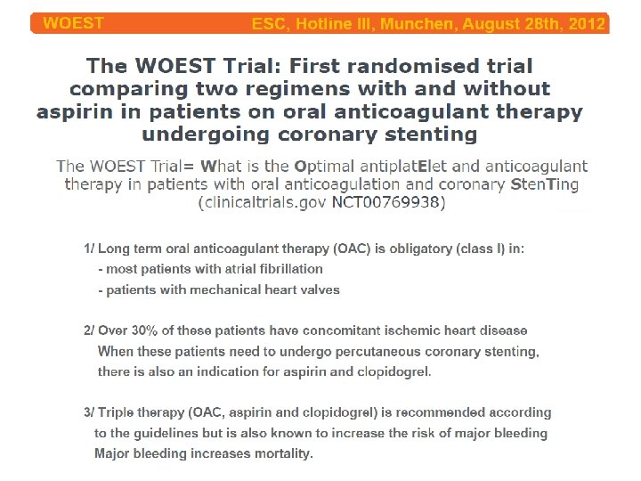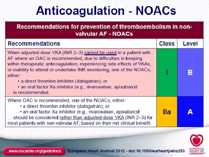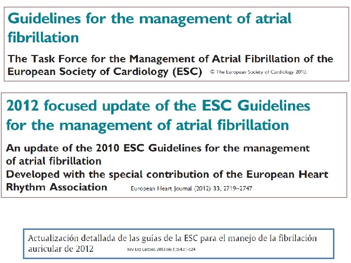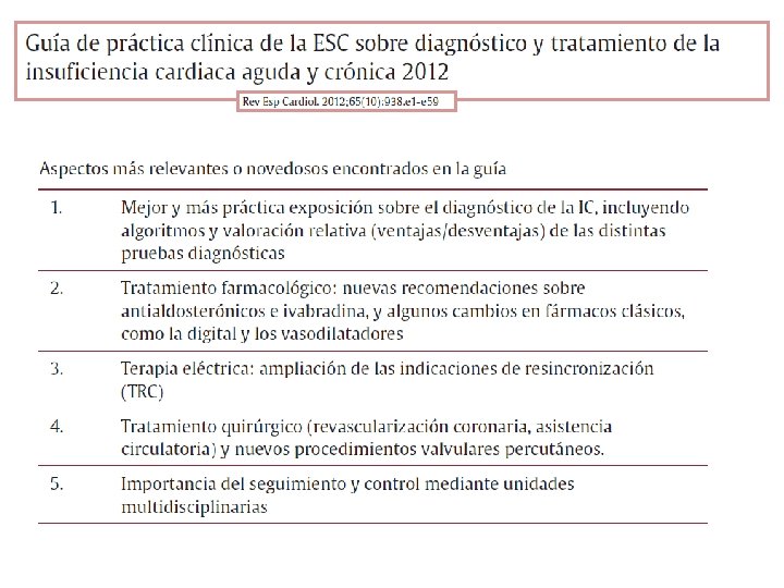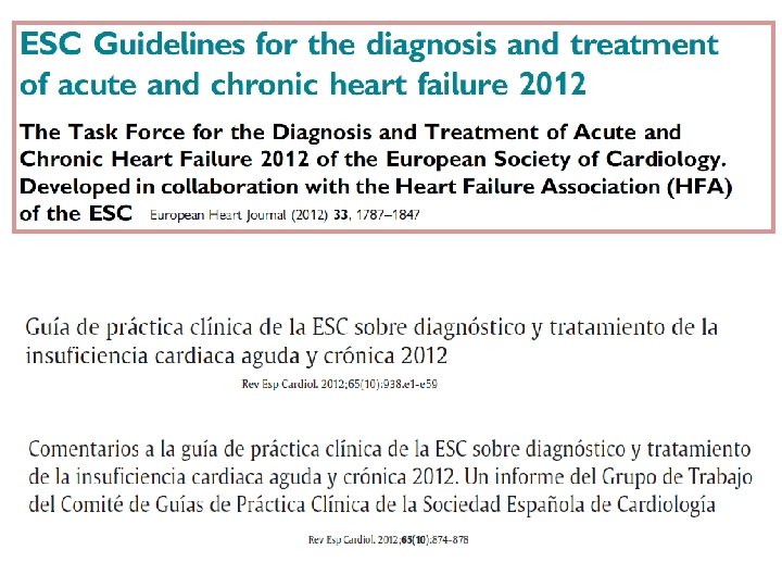 INSUFICIENCIA CARDÍACA * GUIAS ESC 2012 IC - Péptidos natriuréticos en el diagnóstico de IC - Antagonistas de la aldosterona - Ivabradina * ICFEP: LCZ 696 (PARAMOUNT), espironolactona (ALDO-DHF) FIBRILACIÓN AURICULAR * WOEST: Triple terapia vs doble terapia en FA + stent * NACO: ACTUALIZACIÓN 2012 GUIAS ESC * NACO: Instrucción Ministerio Sanidad 19/12 CARDIOPATIA ISQUÉMICA y OTRAS ENFERMEDADES CARDIOVASCULARES * ALTITUDE: Aliskiren en DM-2. End points cardiorenales * GUIAS ESC 2012 SCAEST * TAVI