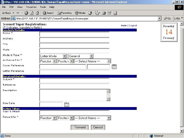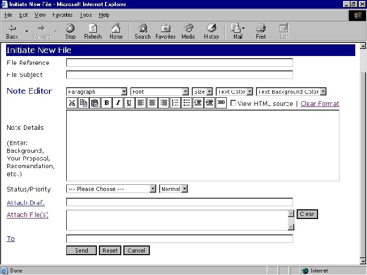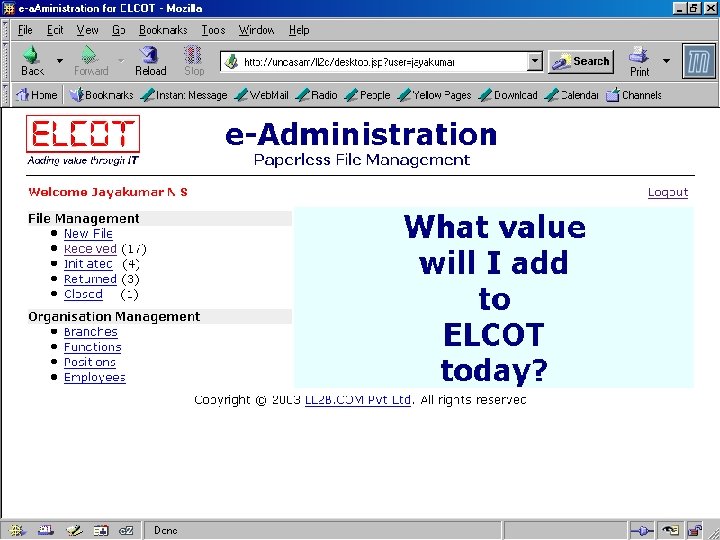 e-Administration Paper-less File Management Technical Features • Web-enabled solution • Developed on open source • Platform independent • Robust back-end • n -Tier architecture • Follows MVC design pattern