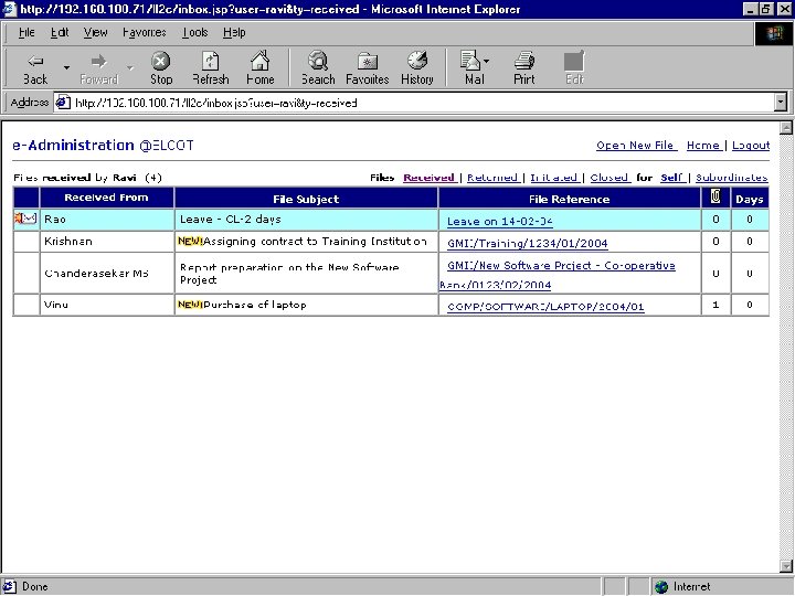 e-Administration Paper-less File Management Electronic System • • Scan inward Tapals Allot automatic Diary Number Forward electronically Instant receipt of Tapal Electronic File Generation Obtain quick sanction Track File movement / delay