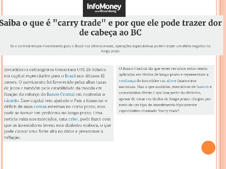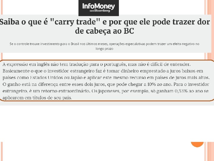 COVERED INTEREST ARBITRAGE Exemplo Numerico: Nos precisamos da taxa de câmbio spot BRL/MXN e a taxa futura para uma ano para responder esta questão. Note que se não utilizamos o derivativo para travarmos o câmbio, não teremos uma estratégia livre sem risco (Carry-trade)