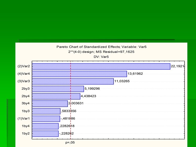 Planejamentos saturados § Erro padrão = 1, 40 § Efeitos significativos Var 1 , 2, 5 e 7. . § Novos ensaios. . . ? ?