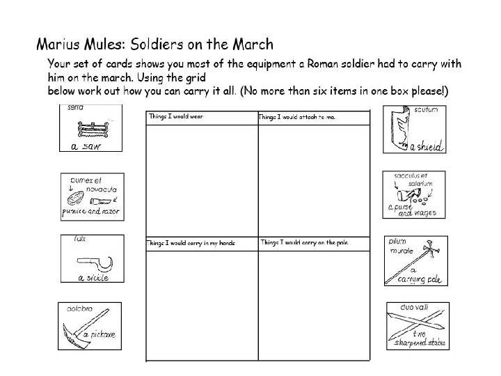 Making an activity • Curriculum goal To understand how much a Roman soldier had to carry. To learn technical terms for equipment used by Roman soldiers. To develop empathy with characters in the past.