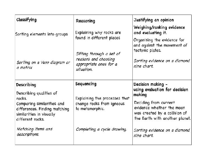 A list of different kinds of thinking demands Classifying-Comparing-Contrasting-Defining-Describing. Estimating-Evaluating-Explaining-Formulating hypotheses. Generalising-Inferring-Interpreting data-Judging-Justifying opinions-Labelling-Measuring-Noting a process-Ordering chronologically-Ordering spatially-Predicting-Problem solving. Rank ordering-Recommending-Testing hypotheses. Understanding and applying cause and effect-Understanding and applying rules and strategies Too many to help planning but they can be reduced to…….