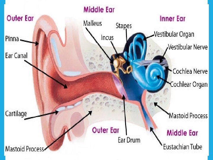 PARTS OF EAR • Three parts 1. 2. 3. a) b) External ear: Collect and conduct the sound wave to the tympanic membrane Middle ear: Filled with air, Intensifies the force of sound vibration Internal ear: consists of. Organ of corti- concerned with hearing Vestibule & semicircular duct- concerned with balancing
