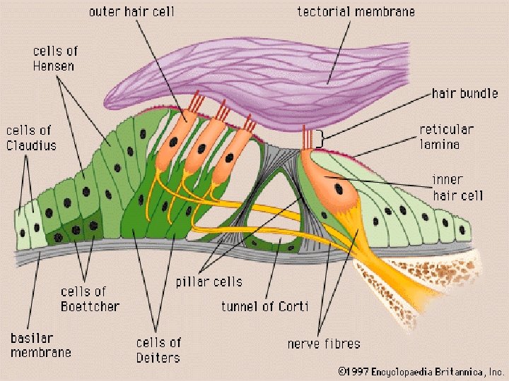 SPIRAL ORGAN OF CORTI • It contains special auditory receptors , rest on basilar membrane of cochlear duct. Organ of corti contains hair cells, which respond to different sound frequency. The most characteristic feature of hair cells is the presence of array of sterocilia. The afferent fibers of cochlear nerve come in direct synaptic contact with the hair cells. Between these cells following supporting cells are found: – Pillar (rod) cells, Deiter’s cells and Hensen’s cells