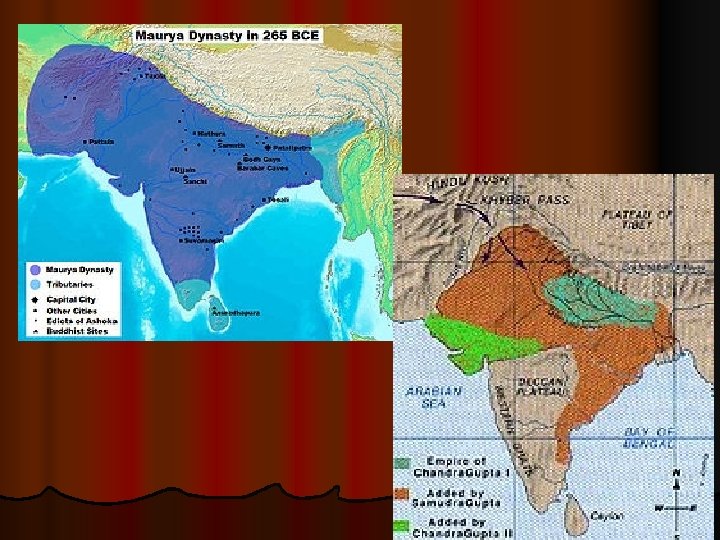 India’s Empire Develops D. In 301 BC Maurya’s son assumed the throne and ruled for 32 years. E. Maurya’s grandson Asoka (Ashoka) then ruled the Mauryan Empire from 269 -232 BC. 1. Asoka followed his grandfather’s example, waging war to expand his empire. 2. Feeling guilty, Asoka began studying Buddhism. 3. Asoka began promoting peace, fairness, and religious toleration. 4. He also began building roads across the empire, with wells and rest areas every 9 miles. F. Asoka’s death in 232 BC left regional kings to their own devices.