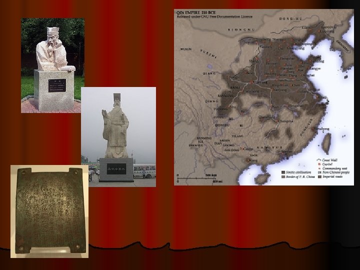 Qin Dynasty Background (221 - 207 BC) I. Qin (chihn) Dynasty (221 -207 BC) A. By around 480 B. C. , China was made up of seven kingdoms which were constantly at war with each other. 1. Society moved away from its ancient values of social order and peace. 2. Scholars began developing ways to restore these values (Confucianism, Daoism, and Legalism). B. In 221 B. C. , Shi Huangdi conquered all the other kingdoms to become China’s first emperor. 1. Controlled nobles by forcing them to move to the capital city of Xianyang and took away their armies. C. United the Empire 1. Built new roads and canals to link the different parts of his empire. 2. Same types of coins, weights, and measures made it easier for people to trade 3. Introduced a standard form of writing throughout the empire. 4. Forced labor to build the First Great Wall. a. Massive wall built to protect China from attacks by northern tribes. 1 a. What is today called the Great Wall was actually built close to two thousand years later, during the Ming dynasty.