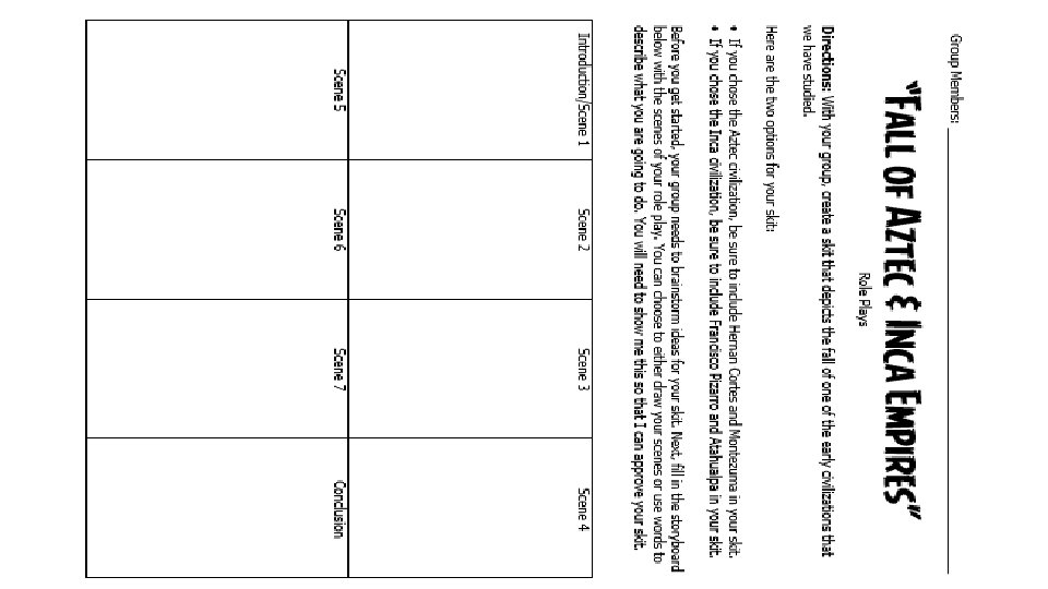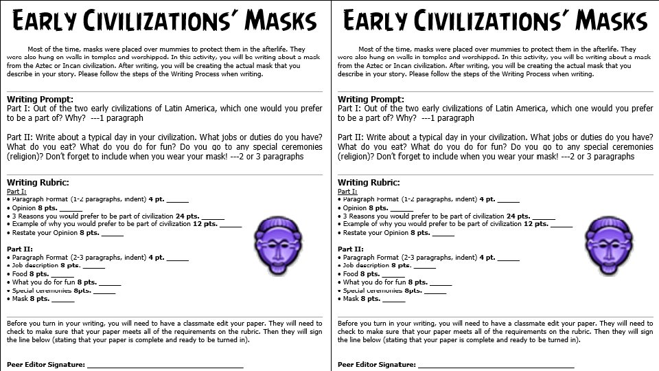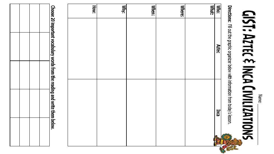 Teachers Alphabet Sentences: Place alphabet letters into a container and have each student draw one letter from the container. Tell students to create a sentence that begins with that letter to summarize either the Aztec or Incan civilization. Allow students to share their sentences. Have the class determine whether the sentence was written for the Aztecs or the Incas. (Note: You may want to exclude letters that may be difficult for students to use at the beginning of their sentences. )