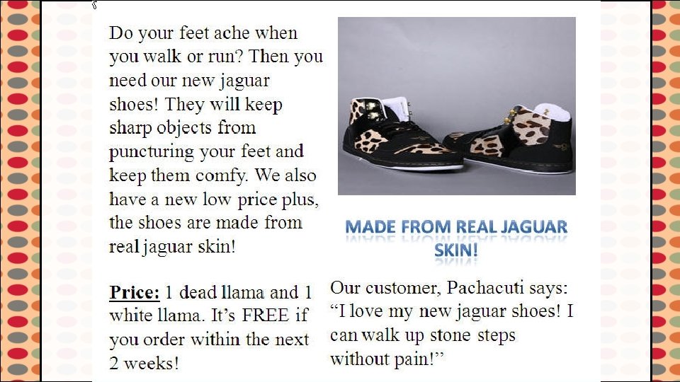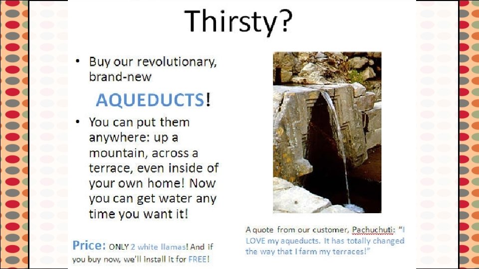 History Advertisement Your Task: Create an advertisement for a technological advance in the Inca civilization. This should be a 1 page advertisement that could be in a magazine or newspaper. Advertisement must include: • Colorful drawing • Why people should be interested… • Price • List of what the item does • “Quote” from an Inca living at the time Choose one of the following: • Quipu, terrace, jaguar, aqueduct, runner, better idea? ?